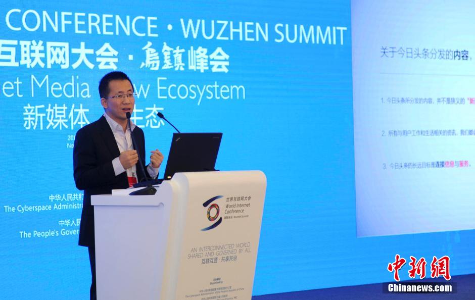 11月19日,今日头条CEO张一鸣在浙江乌镇举行的首届世界互联网大会新媒体分论坛上发言。当天,世界互联网大会在浙江乌镇拉开帷幕。 中新社发 李晨韵 摄