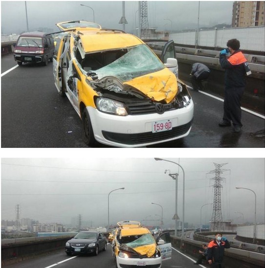 据台湾联合新闻网2月4日报道,台北市4日上午传出复兴航空民航机坠落河面的意外,一辆行驶于环东快速道路上的出租车,意外受到机翼波及,车上包括一名女乘客被送往台北忠孝医院救治。图为飞机坠落时砸到了停在桥上的的士汽车。ep2安康新闻网 ep2安康新闻网