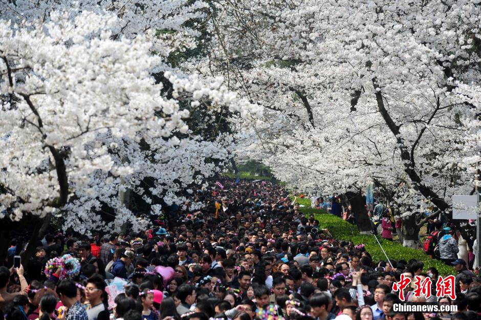 3月21日,武大樱花盛开游客如织。当日,武大樱花盛开的首个双休日。长约200米的樱花大道上1000多株樱花竞相绽放,吸引着数万游客,使宁静的校园变成了热闹的公园。中新社发张畅 摄Suf安康新闻网