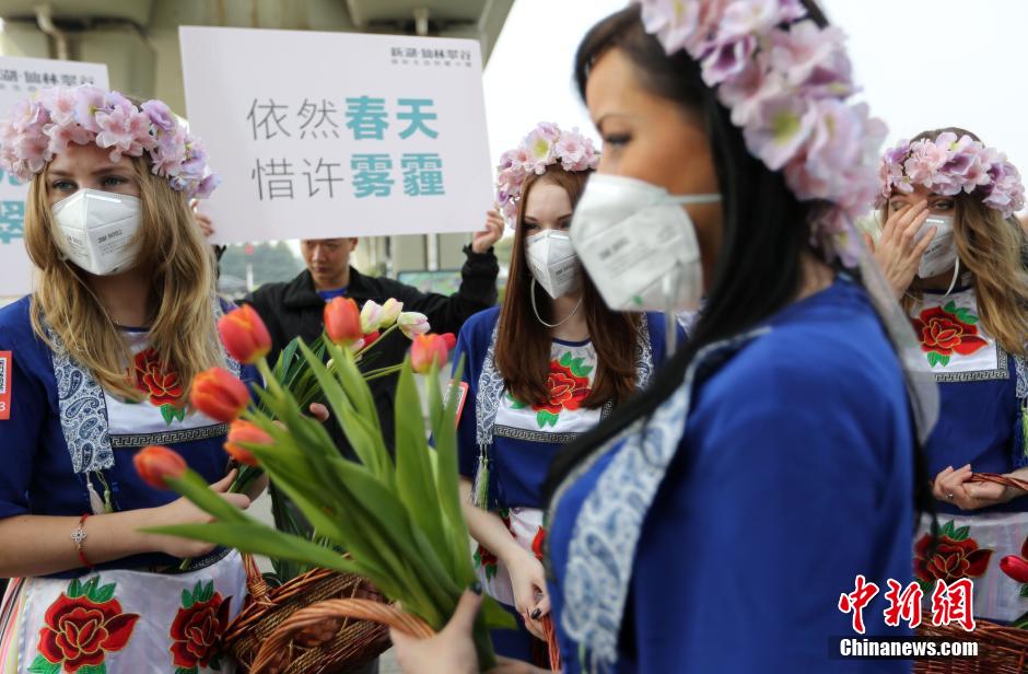 3月30日,六位靓丽“花仙子”统一着装来到南京仙林地铁二号线沿线新湖仙林翠谷,戴着过滤式口罩向过往的市民分发郁金香,以此提醒人们对空气环境的关注、倡导绿色环保生活。中新社发 泱波 摄Am6安康新闻网