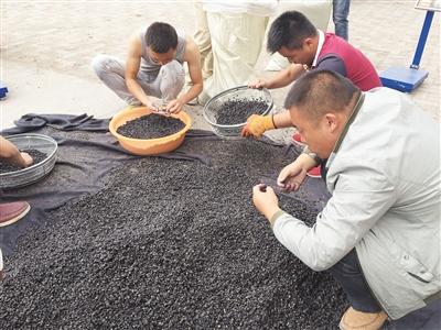 筛子里豌豆粒大小的黑枸杞,夹杂在土块石子之间翻滚。他把黑枸杞滤出来,放在一边,枸杞叶子放在另一边,剩下的杂物,让工人用手挑选,“一粒也别剩下。”