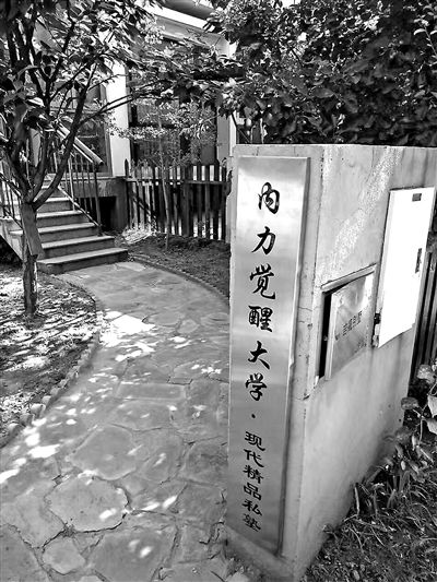 在一楼通往二楼的楼梯拐角处,能清楚地看到内力觉醒大学精品私塾办学模式的牌子“军事化管理、一束花教育、自主式学习、艰苦化生活、淘汰式选择、历史化熏陶、百家式讲课、行走化风格、个性化发展、合并式内容”。文/本报记者 林艳 武文娟