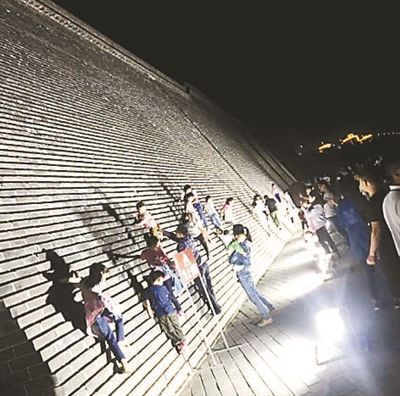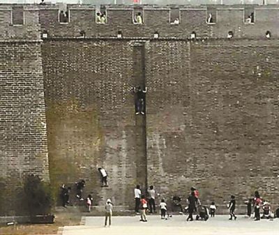 北京青年报记者在网友提供的照片中看到,正定古城墙外壁的墙砖间形成了一级级两三厘米宽的小台阶,十几个孩童侧着身子、徒手攀爬至两三米高处,家长们站在城墙下给孩子拍照,而一旁“禁止攀爬”的警示牌则被无视。更有成年攀爬者在没有保护措施的情况下,徒手攀爬至六七米高。众多游客攀爬城墙,远看好似攻城,甚至让部分游客误以为这是该旅游景点的游乐项目。