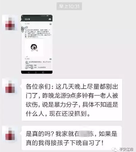 【传闻】有网传消息称,“各位亲们,这几天晚上尽量别出门了,昨晚9点多辽阳龙源有一老人被砍伤,说是暴力分子,具体不知道是什么人,现在还没抓到”。
