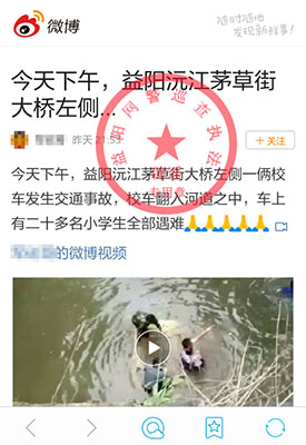 【传闻】9月7日,一名为“军砣哥”的网民在微博发帖称,“今天下午,益阳茅草街左侧一辆校车发生交通事故,校车翻入河道之中,车上有二十多名小学生全部遇难”,并附上现场车辆坠河视频,该消息很快被部分网民转发。