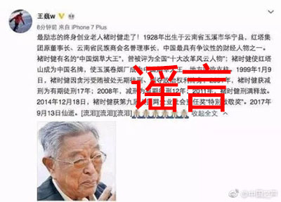 【传闻】中国金融博物馆理事长王巍发布微博称,知名企业家褚时健去世,该消息一出,引发网民大量转发。