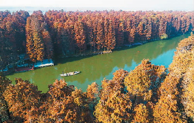 江苏省兴化市水上森林是人工生态林,以“林中有水、水中有鱼、林内有鸟、河流回环、杉树林立”的景观闻名遐迩,吸引不少游客乘船游览。