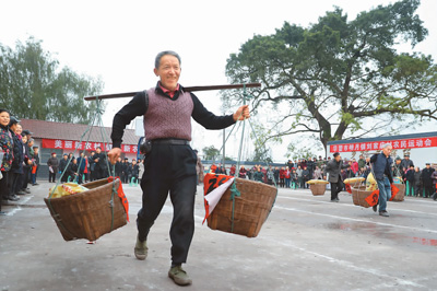 近日,四川省华蓥市明月镇刘家庙村举行以“美丽新农村,健康新农民”为主题的农民运动会。通过精准扶贫逐渐走上致富之路、过上幸福生活的村民参加了挑担子、包抄手、套圈等趣味竞技项目,以这种特别的方式庆祝丰收。图为刘家庙村村民在参加挑担子比赛。8Wf安康新闻网