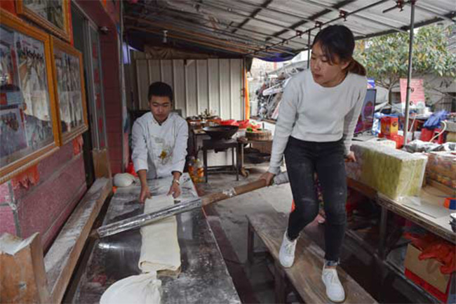 1月3日,郭炜兰(右)骑在一根1米多长、碗口粗的擀面杖上,上下跳动,用身体的力量将另一端的面团压成扁条形,这就是“骑木杖”擀面。