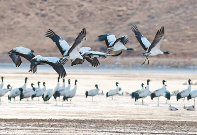 1月1日,西藏拉萨市林周县卡孜水库附近的黑颈鹤。VSp安康新闻网