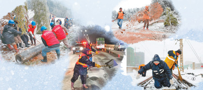 图④:25日,安徽蚌埠固镇火车站值班员在清理积雪冰块。