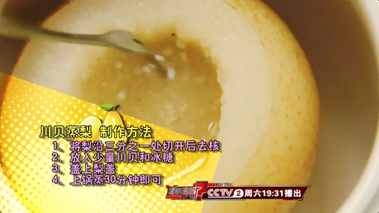 除了煮梨水,上锅蒸也是非常好的方法。把梨从顶部切开后去核,放入少量川贝和冰糖,上锅蒸30分钟。出锅后梨汁梨肉一起吃,化痰止咳效果也很好。但一定要注意,无论是川贝煮梨水还是川贝蒸梨,只对阴虚肺热和风燥伤肺引起的干咳治疗效果明显。同时专家也提醒大家,食疗最多三日,如果咳嗽持续没有缓解,还是要及时就医,以免耽误病情。(孝金波、王亚静 整理)