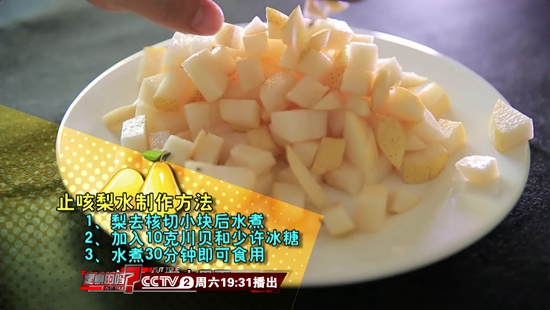 刘琳告诉我们:“梨有秋梨,雪花梨,鸭梨等,通常情况下都可以,但其中以雪花梨为最优。选择梨时应尽可能选择梨皮较厚且较粗糙的,因为梨皮作为药材的治疗作用是不可小觑的。加工过程中应保留梨皮,去籽,将梨切为小块,然后配以少许川贝、冰糖一起放入水中煮至半小时,即可饮用。”