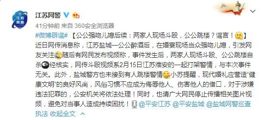 2月26日9时3 3分,江苏省公安厅网络安全保卫总队官方微博“江苏网警”对此辟谣,“经核实,网传斗殴视频系2月15日江苏淮安的一起打架警情,与本次事件无关。此外,盐城警方也未接到有人跳楼警情。”