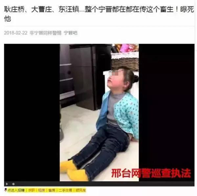 随后,“父亲打女儿”的视频配上了“某地都在传这个畜生!曝死他”等标题在各地的微信群、自媒体平台疯狂传播,并配文称视频内的父亲是当地人,呼吁当地群众一起寻找这位虐童父亲。