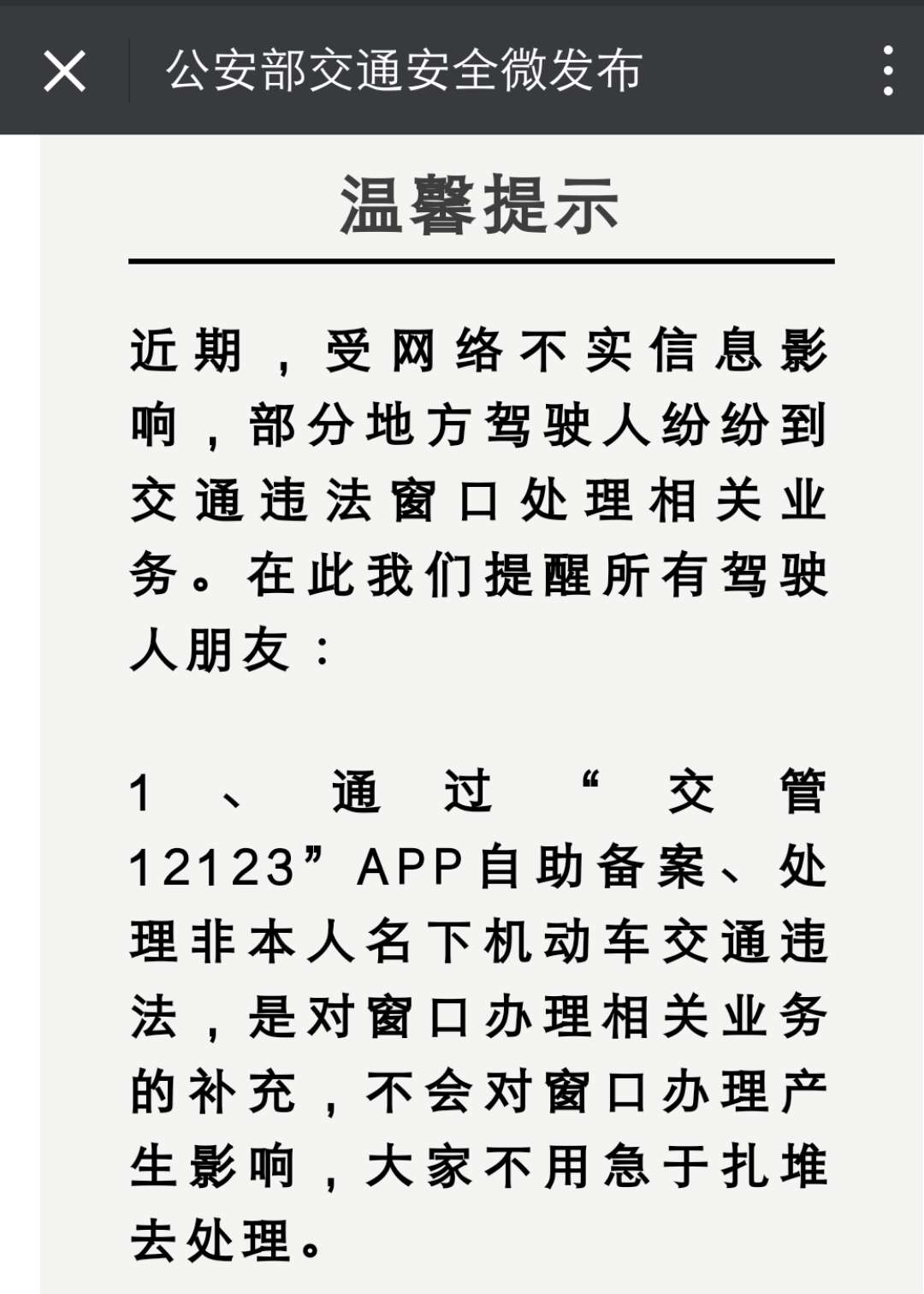 2月26日,公安部交通管理局通过官方微信发布文章,对新增项目推出后群众提出的问题进行答疑,并提醒驾驶人朋友称“通过‘交管12123’APP自助备案、处理非本人名下机动车交通违法,是对窗口办理相关业务的补充,不会对窗口办理产生影响,大家不用急于扎堆去处理。”同日,北京交警也通过官方微信辟谣称“3月1日起,不绑定备案就不能处理非本人名下车辆违法”系误读,并提示:在北京市,不通过网上渠道处理非本人名下机动车交通违法的车主,依然可以通过各交通支、大队执法站窗口办理。