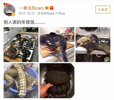 2018年2月15日(除夕)晚7时,微博账号为“一车当先cars”的博主发布了一条名为“别人家的年夜饭……”的消息,并配发一组摆放在厨房里待烹制的熊掌、穿山甲、鳄鱼等野生动物的照片,引发了网民的广泛关注和大量转发。