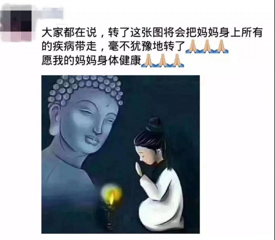 “愿母亲幸福安康”、“据说这张图会把爸妈身上的疾病带走”……烛光下,白衣束发人士单手合十,对着慈眉善目的“菩萨”虔诚跪拜,春节假期,这幅“地藏菩萨图”在朋友圈热传,不少网友转发并配上祝福家人的文字。
