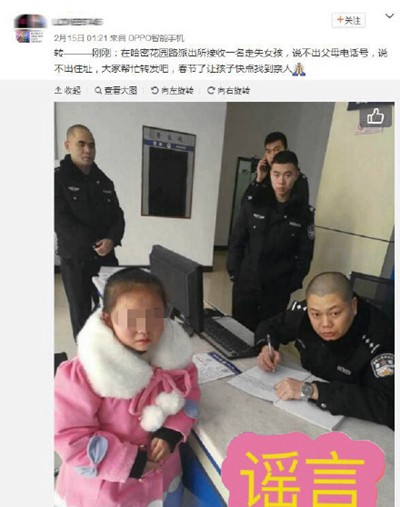 与此类似的谣言还有“在某某路派出所接收一名走失女孩,说不出父母电话号,说不出住址,大家帮忙转发吧,春节了让孩子快点找到亲人”。经警方核实,该事发生在四川省自贡市,女孩已于2月13日被其父母接回。该谣言在全国多个省市传播,各地网警纷纷辟谣,请大家不要继续传播!
