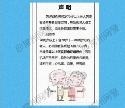 正值春运,朋友圈出现一条“温馨提示”称,70周岁以上(含70岁)——80周岁以内老人,必须提供三级甲等以上医院健康证明原件,否则机场不予放行。证明内容包括:心电图、血压、呼吸道。