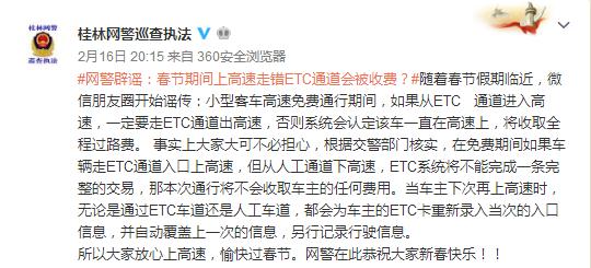 春节假期,微信朋友圈谣传:小型客车高速免费通行期间,如果从ETC通道进入高速,一定要走ETC通道出高速,否则系统会认定该车一直在高速上,将收取全程过路费。