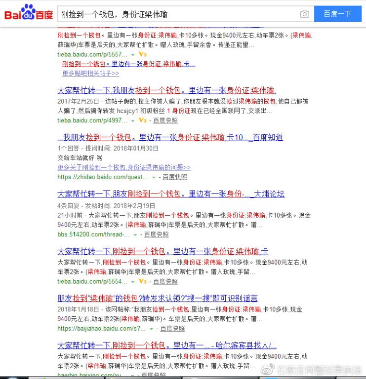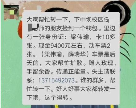 一条“失物招领”的信息在全国多地的微信群和朋友圈中热传,该信息称:“我朋友捡到一个钱包,里边有一张身份证:梁伟瑜,卡10多张,现金9400元左右,动车票2张(梁伟瑜,薛瑞华)。车票是后天的,大家帮忙扩散。赠人玫瑰,手留余香。传递正能量。失主请联系:1362098XXXX。谁的群多,帮忙转一下……”