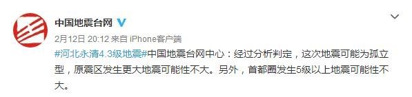 朋友圈内传播一条假冒官方通知的消息称“检测局紧急通知,因地壳变动今晚津京冀地区,八点到凌晨六点有间接性地震发生,3~5级,请大家做好避震准备以防有危险发生。检测局2018.2.12 16点40分通知”。12日20时02分,中国地震台网官微发布消息称,“经过分析判定,这次地震可能为孤立型,原震区发生更大地震可能性不大。另外,首都圈发生5级以上地震可能性不大”。并提醒大家“遇到地震传言时请不信谣、不传谣!”
