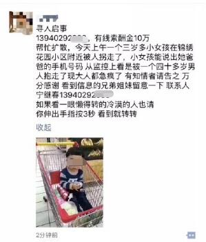 近日,多地网民转发图片称“今天上午宁继春的三岁女儿在锦绣花园小区附近被人拐走了,女儿能说出她爸爸的手机号码……从监控上看,小女孩是被一个四十多岁男人抱走了,现大人都急疯了,有知情者请告之。万分感谢……”