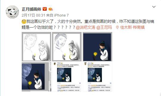 17日凌晨,该图的原作者“正月插画师”,微博认证为“插画师、美术教师”,发布消息称“我这画似乎火了,火的十分突然。重点是我画的时候,咋不知道这张图与锦鲤是一个功效的呢??????”