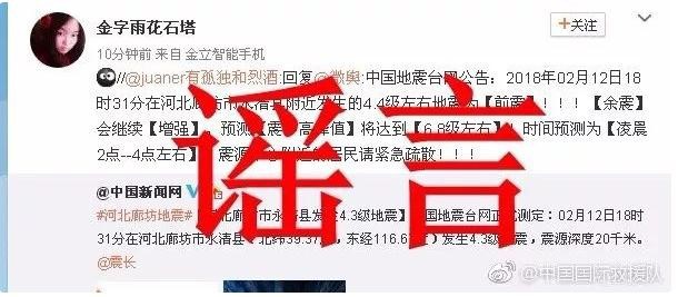 2月12日,河北永清地震发生不久后,网上有消息称该县“9958应急救援队接到通知,今晚11点30分有余震活动。”12日19时57分,河北省廊坊市人民政府新闻办官微“廊坊发布”对此辟谣称,“纯属谣言,公安部门正在追查谣言的源头,请广大群众勿信勿传谣言,以权威发布为准。”