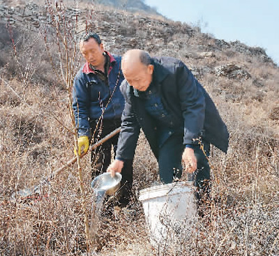 在河北省邢台县太子井乡峰门村一带的山场,当地农民给刚栽植的树苗浇水。新华社记者 杨世尧摄Y6M安康新闻网