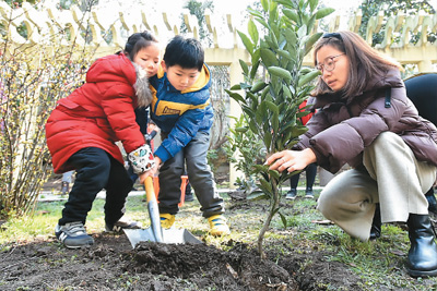 江苏省扬州市汶河街道树人苑社区开展“我和小树共成长”主题植树活动,请小朋友和家长种植果树苗,增强孩子们的爱绿护绿意识。庄文斌摄(新华社发)Y6M安康新闻网