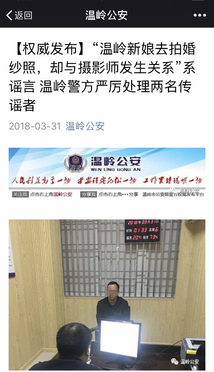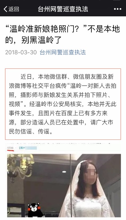 3月30日,台州市公安局网警官微发布消息,所谓“温岭准新娘艳照门”不是本地的,别黑温岭了。其中指出,“本地并无此事件发生”,该谣言中的“图片在百度上已有多方来源”,并称“部分造谣人员已在处置中”。