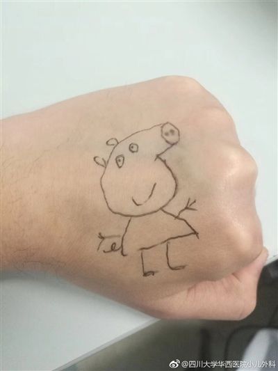 4月7日,四川大学华西医院小儿外科官方微博“四川大学华西医院小儿外科”发布一条微博,微博中,一位华西医生的手上画了一个卡通人物小猪佩奇。