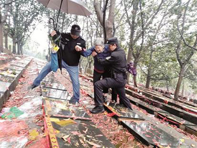 湖北武汉汉阳永丰派出所协警潘正好介绍,当日上午11时许,他和另外一名同事正在公墓内巡逻执勤时,接到一女子求助,称南九墓区有位老人滑倒。他们赶到现场后,先将老人搀扶上了巡逻车。