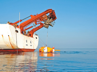图为24日科考队员在布放“潜龙三号”,从母船将其放入水中。(记者 刘诗平 摄)