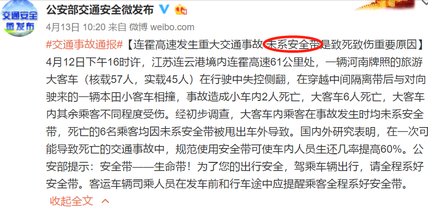4月12日下午,江苏连云港境内连霍高速61公里处,一辆河南牌照的旅游大客车在行驶中失控侧翻,在穿越中间隔离带后与对向驶来的一辆本田小客车相撞,事故造成小车内2人死亡,大客车6人死亡,大客车内其余乘客不同程度受伤。经初步调查,大客车内乘客在事故发生时均未系安全带,死亡的6名乘客均因未系安全带被甩出车外导致。