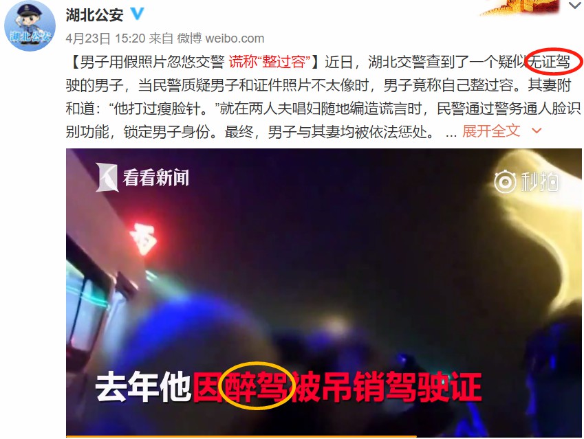 据“湖北公安”4月23日称,近日,湖北交警查到了一个疑似无证驾驶的男子,当民警质疑男子和证件照片不太像时,男子竟称自己整过容。其妻附和道:“他打过瘦脸针。”就在两人夫唱妇随地编造谎言时,民警通过警务通人脸识别功能,锁定男子身份。该男子去年因醉驾被吊销驾驶证,最终,男子与其妻均被依法惩处。