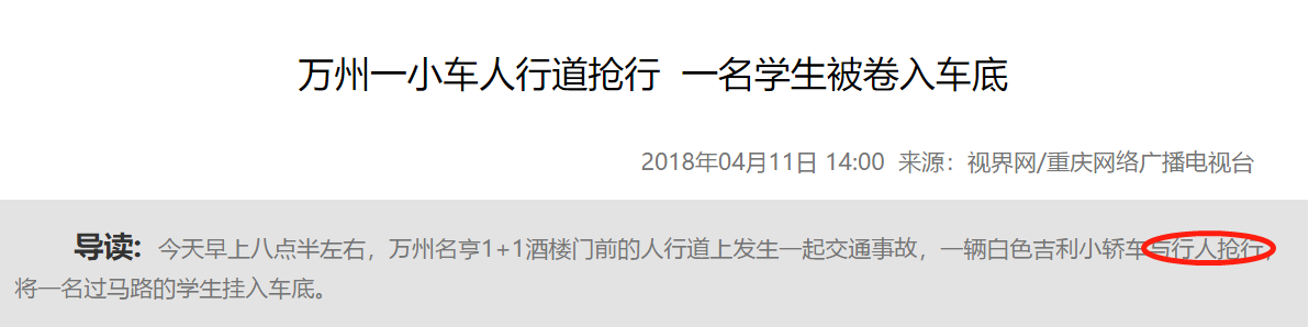 4月11日,重庆市万州区某酒楼门前的人行道上发生一起交通事故,一辆白色吉利小轿车与行人抢行,将一名过马路的学生挂入车底。众人将汽车抬起后,受伤儿童被救出并送往三峡中心医院抢救。