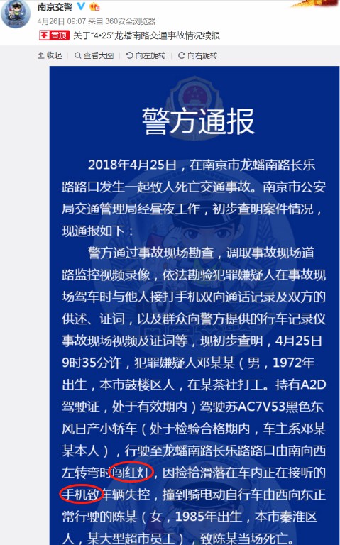 2018年4月25日,在江苏省南京市发生一起致人死亡交通事故。经警方调查,犯罪嫌疑人邓某某驾驶某小轿车行驶至龙蟠南路长乐路路口由南向西左转弯时闯红灯,因捡拾滑落在车内正在接听的手机致车辆失控,撞到骑电动自行车由西向东正常行驶的陈某,致陈某当场死亡。