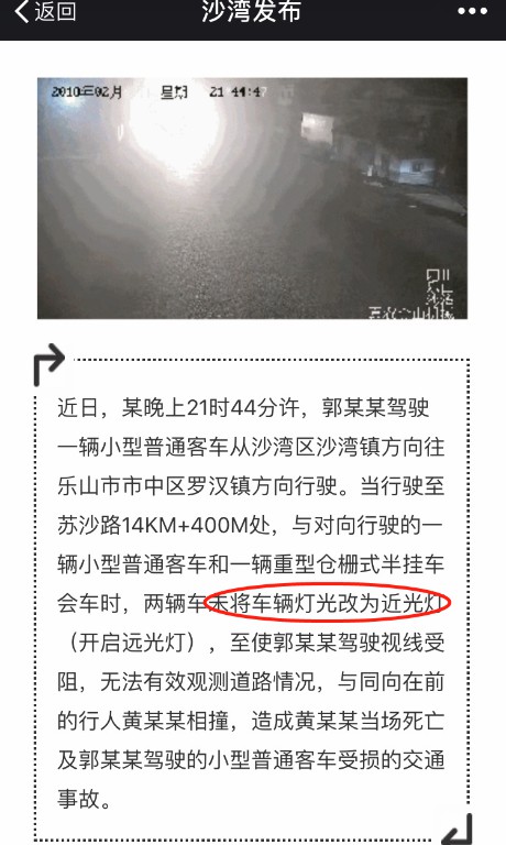 据“沙湾发布”4月26日报道,近日,某晚上21时44分许,郭某某驾驶一辆小型普通客车从四川省乐山市沙湾区沙湾镇方向往乐山市市中区罗汉镇方向行驶。当行驶至苏沙路14KM+400M处,与对向行驶的一辆小型普通客车和一辆重型仓栅式半挂车会车时,两辆车未将车辆灯光改为近光灯(开启远光灯),至使郭某某驾驶视线受阻,无法有效观测道路情况,与同向在前的行人黄某某相撞,造成黄某某当场死亡及郭某某驾驶的小型普通客车受损的交通事故。
