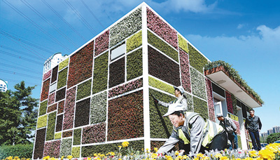 5月3日,北京市丰台区花乡草桥村环卫工人们正在对新建成的“花房式公厕”进行管护。为提升公厕服务品质,以花卉为主导产业的草桥村将绿色、卫生和美观的理念融入到公厕的建设之中,该公厕的四边外墙和房顶均由绿雕墙构成,从侧面看整个房子像是五颜六色的大魔方。NX7安康新闻网