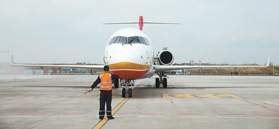 | 图为5月2日,ARJ21—700新支线喷气客机驶进哈尔滨太平国际机场停机坪。(记者 丁汀 摄) |