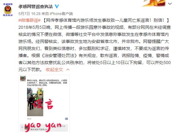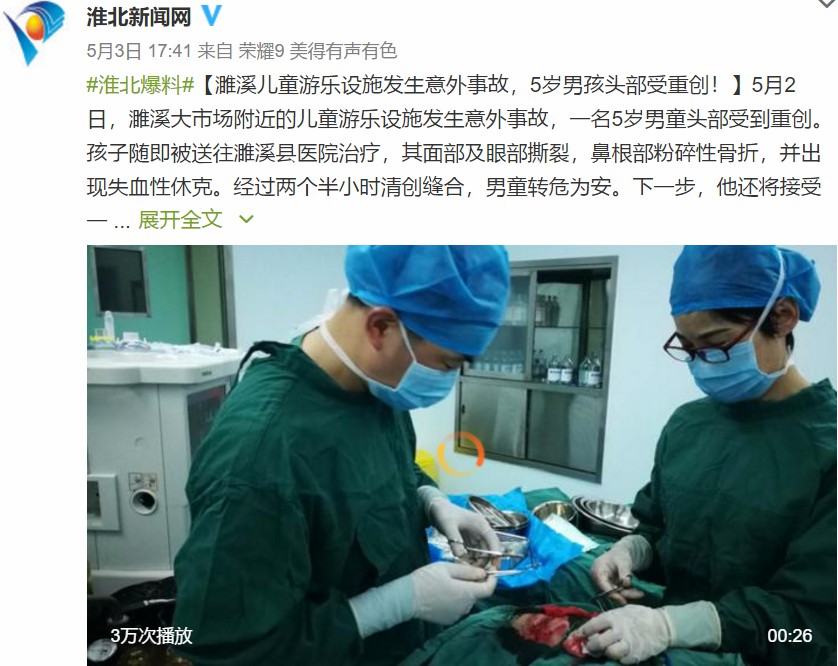 对此,石家庄、孝感等地网警纷纷辟谣。据“淮北新闻网”报道,2018年5月2日,安徽省濉溪县大市场附近的儿童游乐设施发生意外事故,一名5岁男童头部受到重创。孩子随即被送往濉溪县医院治疗,其面部及眼部撕裂,鼻根部粉碎性骨折,并出现失血性休克。经过两个半小时清创缝合,男童转危为安,后续还要继续进行治疗。