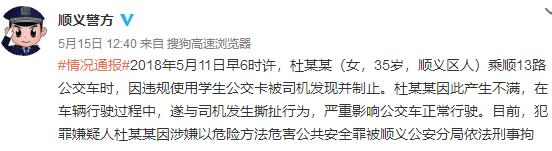 5月15日午间,北京市顺义区警方发布了情况通报。5月11日早6时许,35岁的顺义区女子杜某某在乘顺13路公交车时,因违规使用学生公交卡被司机发现并制止。杜某某因此产生不满,在车辆行驶过程中,遂与司机发生撕扯行为,严重影响公交车正常行驶。目前,犯罪嫌疑人杜某某因涉嫌以危险方法危害公共安全罪被顺义公安分局依法刑事拘留。