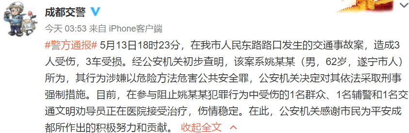 5月14日凌晨3时53分,成都交警通报,此事故造成3人受伤,3车受损。经当地公安机关初步查明,该案系62岁遂宁市姚某某所为,其行为涉嫌以危险方法危害公共安全罪,公安机关决定对其依法采取刑事强制措施。目前,在参与阻止姚某某犯罪行为中受伤的1名群众、1名辅警和1名交通文明劝导员正在医院接受治疗,伤情稳定。公安机关感谢市民为平安成都所作出的积极努力和贡献。