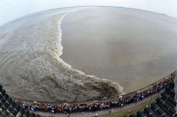 2016年9月18日,记者在浙江海宁市盐官镇占鳌塔上拍摄的钱塘江“一线潮”。新华社记者 黄宗治 摄