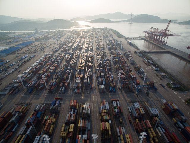 2017年5月9日拍摄的宁波舟山港穿山港区集装箱码头,以北仑港为核心的宁波舟山港年货物吞吐量连续9年位居世界第一。新华社记者 黄宗治 摄