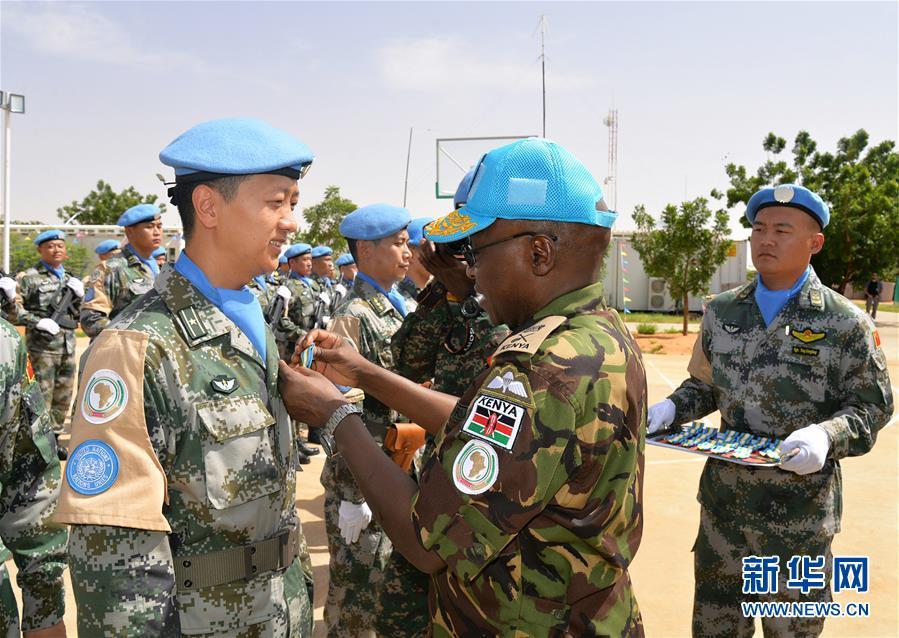 7月15日,在苏丹达尔富尔法希尔,联合国和非洲联盟驻达尔富尔联合特派团(联非达团)部队司令恩贡迪中将(右二)把勋章佩戴在中国维和官兵胸前。中国首支维和直升机分队授勋仪式15日在位于苏丹达尔富尔法希尔的营区举行,全体140名维和官兵荣获联合国“和平荣誉勋章”。新华社发HWQ安康新闻网