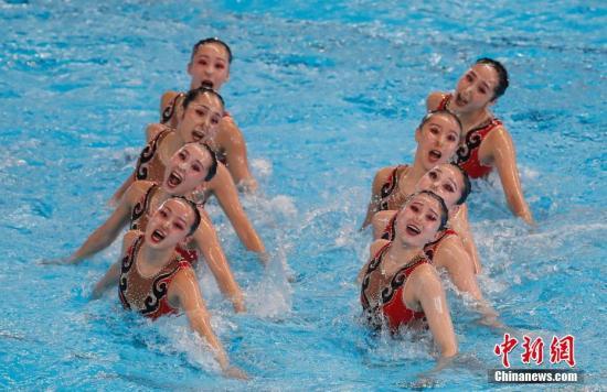 图片说明:在8月29日下午结束的雅加达亚运会花样游泳集体自由自选比赛中,中国队凭借《凤舞国粹》的出色发挥,夺得金牌。中新社记者 杜洋摄